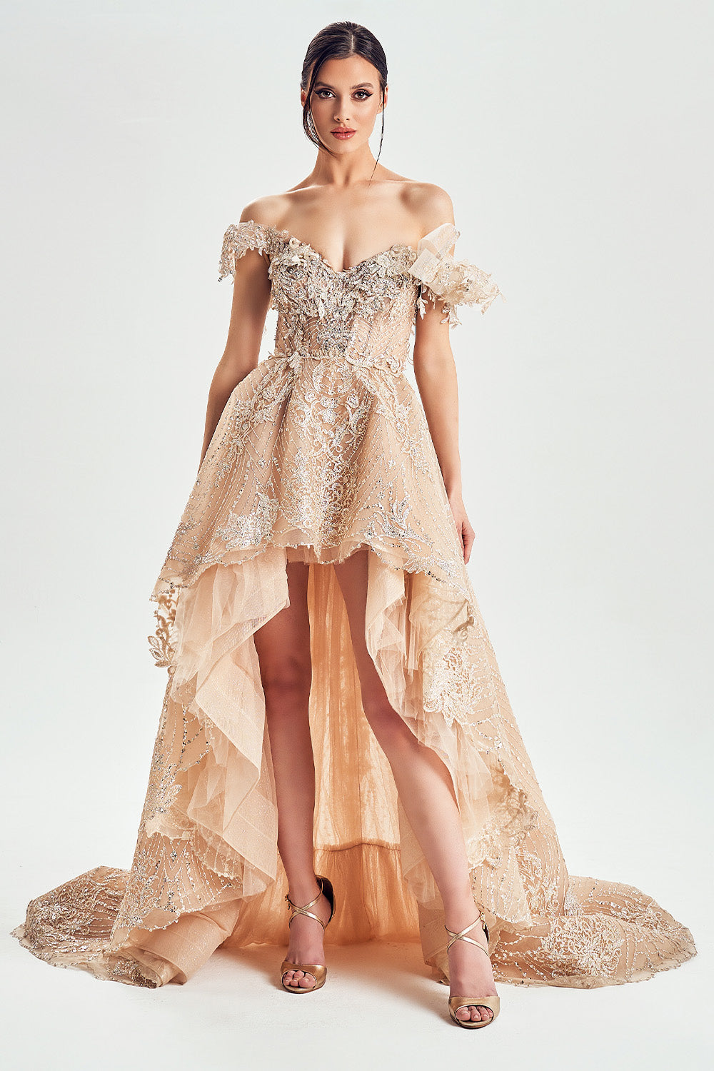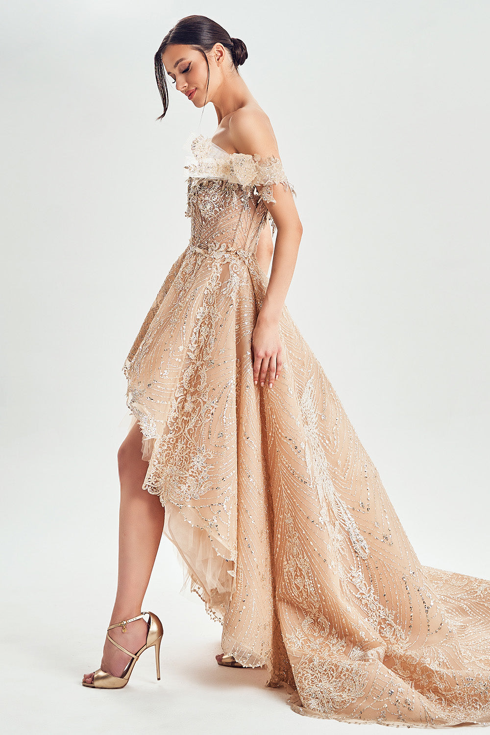 Spektakularna, wieczorowa suknia z odkrytymi ramionami i dopasowanym gorsetem, wykonana z bogato haftowanej koronki z połyskującymi zdobieniami. Kreacja wykończona ręcznie, z jedwabną podszewką zapewniającą komfort noszenia.
