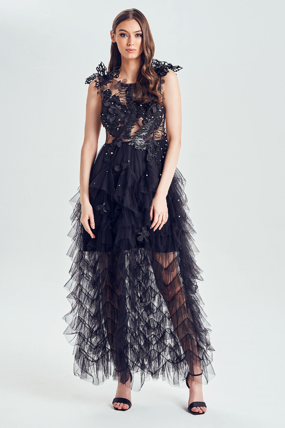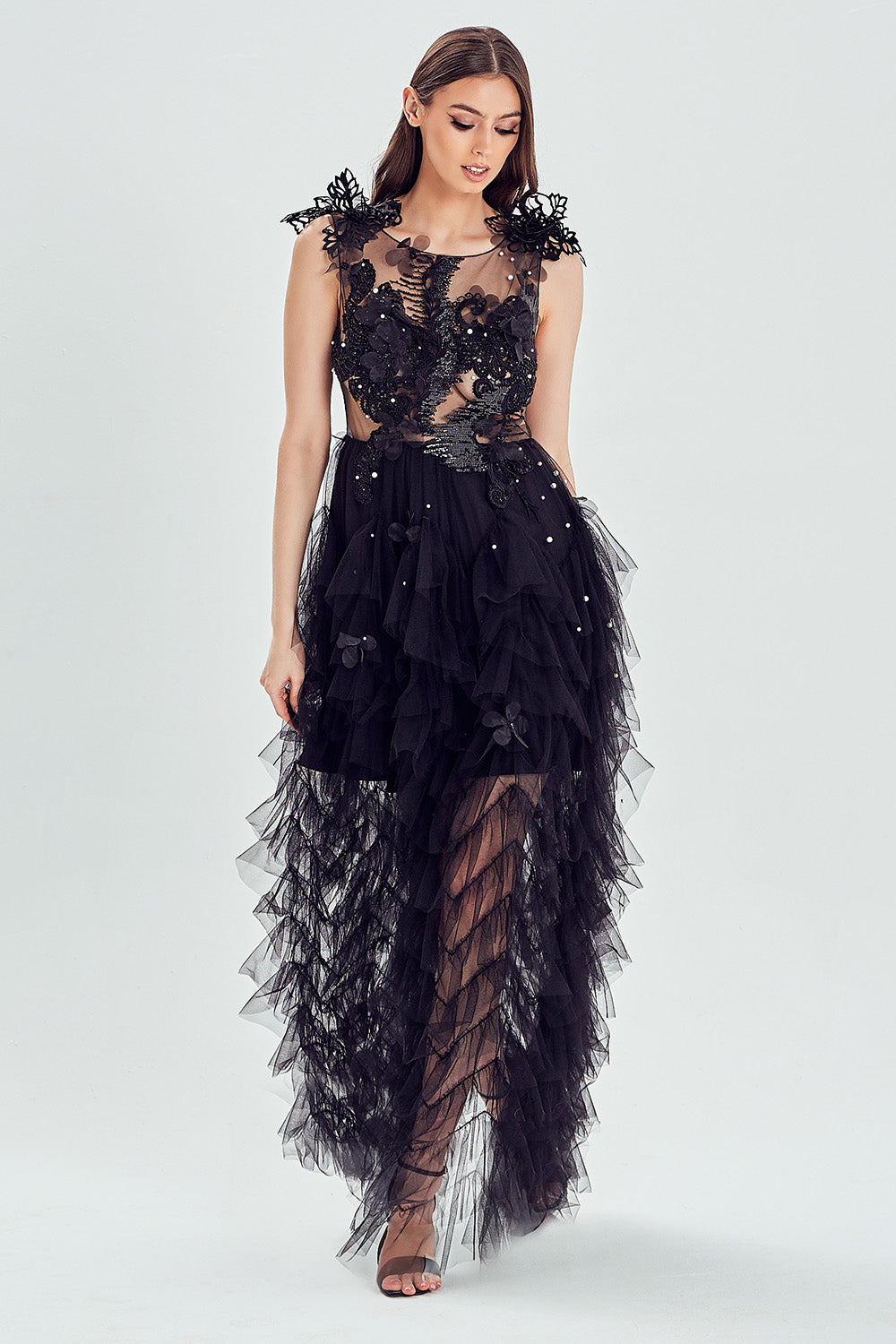 Czarna sukienka z eleganckimi detalami i nowoczesną sylwetką. Półprzezroczysta góra zdobiona jest dekoracyjnymi akcentami, a warstwowe falbany z tiulu dodają lekkości i ruchu. Asymetryczny dół delikatnie podkreśla nogi, tworząc wyrafinowany i stylowy wygląd idealny na wieczorne okazje.