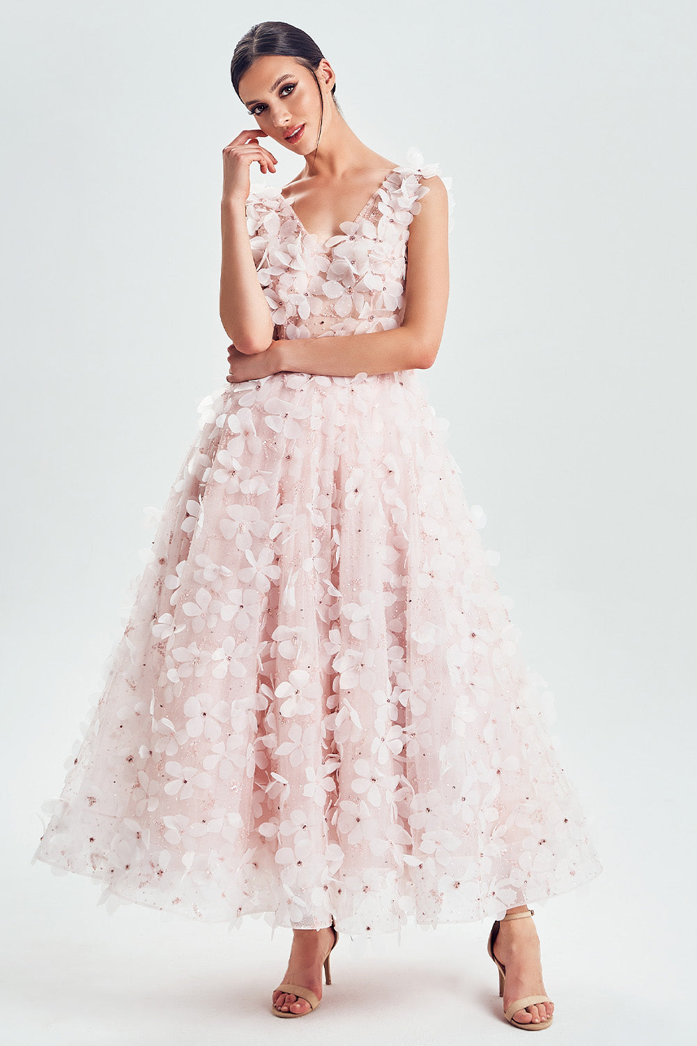 Delikatne warstwy jasnoróżowej tkaniny splatają się z kwiecistymi aplikacjami, tworząc harmonijną całość. Jedwabna podszewka podkreśla miękkość i lekkość formy, a dopracowane detale dodają subtelnego romantyzmu.