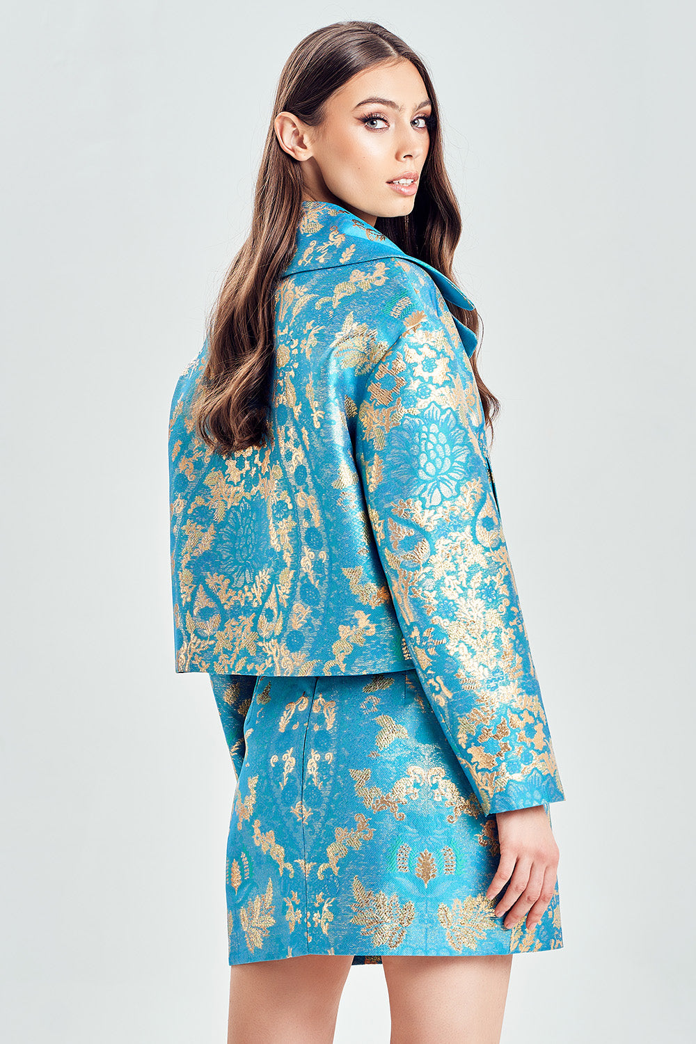 Zestaw z kurtką i spódnicą w głębokich morskich tonach zachwyca złotymi ornamentami i misternymi wzorami. Śmiałe zestawienia kolorów i dopracowany krój podkreślają jego unikalny charakter