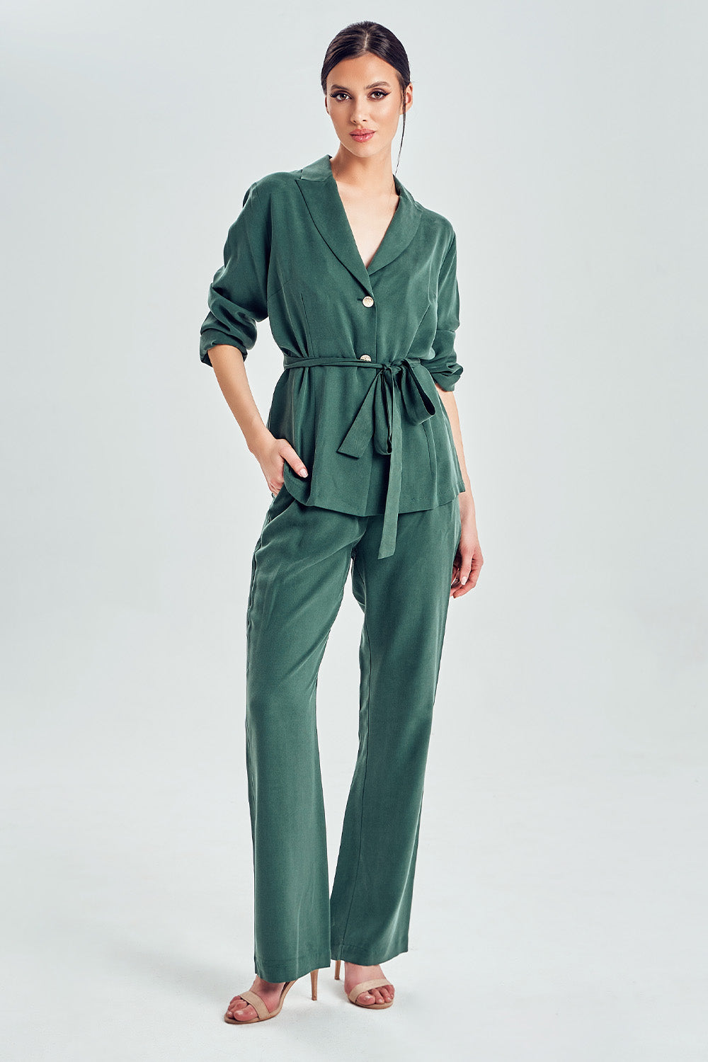 Ten zestaw w głębokim odcieniu zieleni łączy przyjemny w dotyku materiał z luźnym fasonem. Pasek w talii subtelnie podkreśla sylwetkę, a oversize'owy żakiet i proste spodnie dodają lekkości i nowoczesnej elegancji.