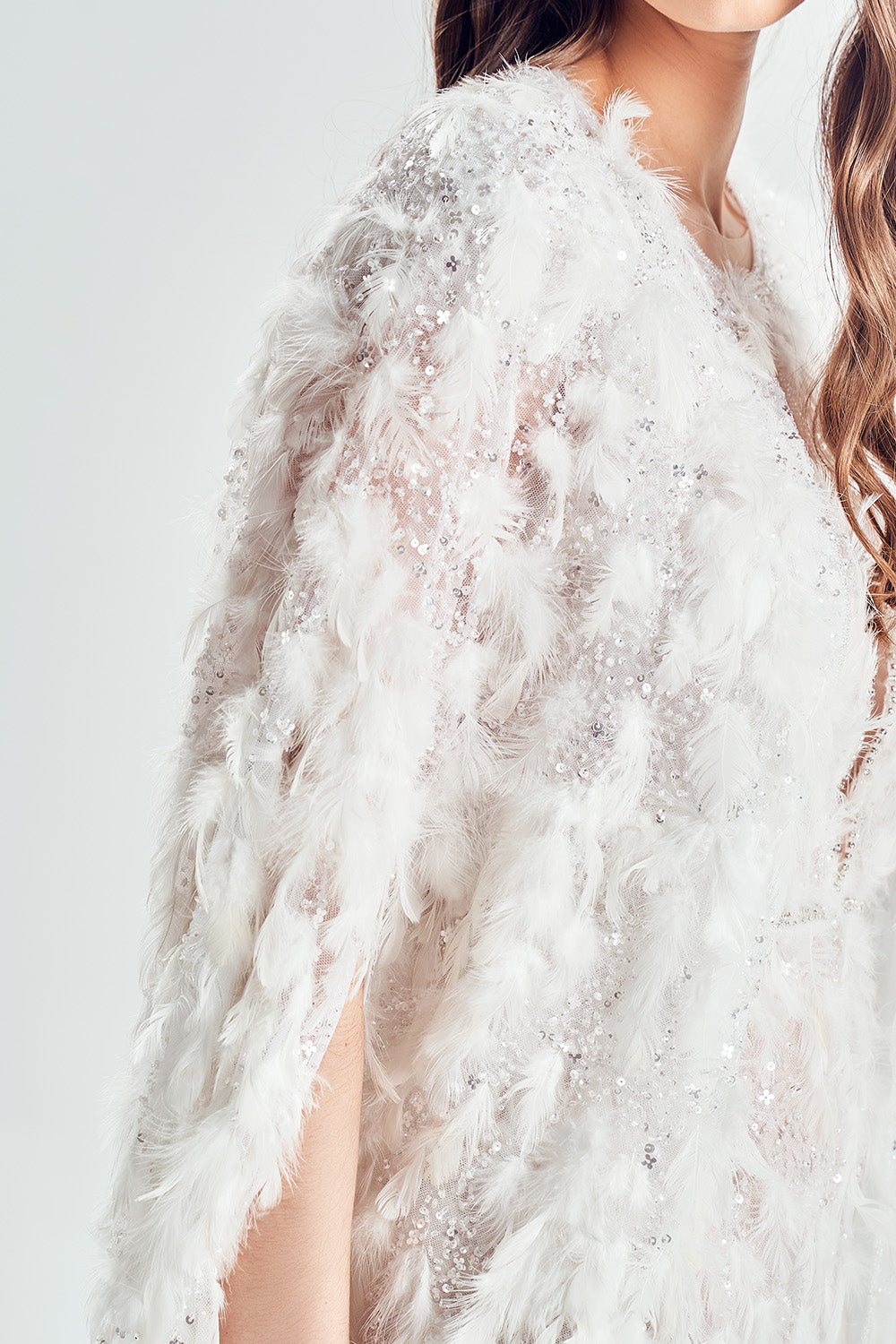 Precyzyjnie skrojona suknia wykonana z koronki wyszywanej cekinami i naturalnymi piórami. Głęboki dekolt oraz zmysłowe rozcięcie przy udzie nadają jej nowoczesnego charakteru, a jedwabna podszewka i ręczne wykończenie gwarantują pełen komfort i perfekcję wykonania.