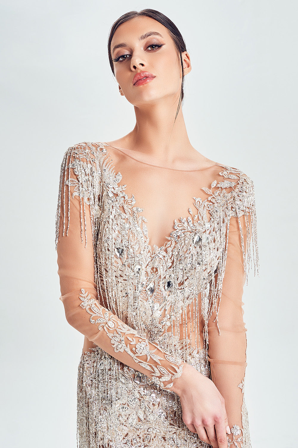 Delikatne, transparentne warstwy tworzą efektowną kompozycję współgrając z subtelnie połyskującymi zdobieniami. Lekki tren wysmukla sylwetkę, a precyzyjne aplikacje podkreślają kunszt wykonania i wyrafinowaną elegancję.