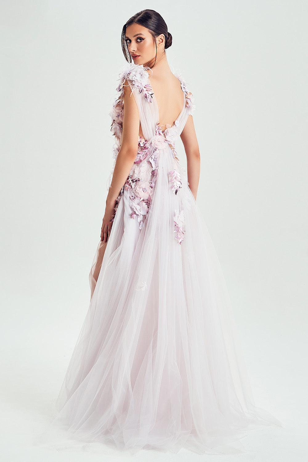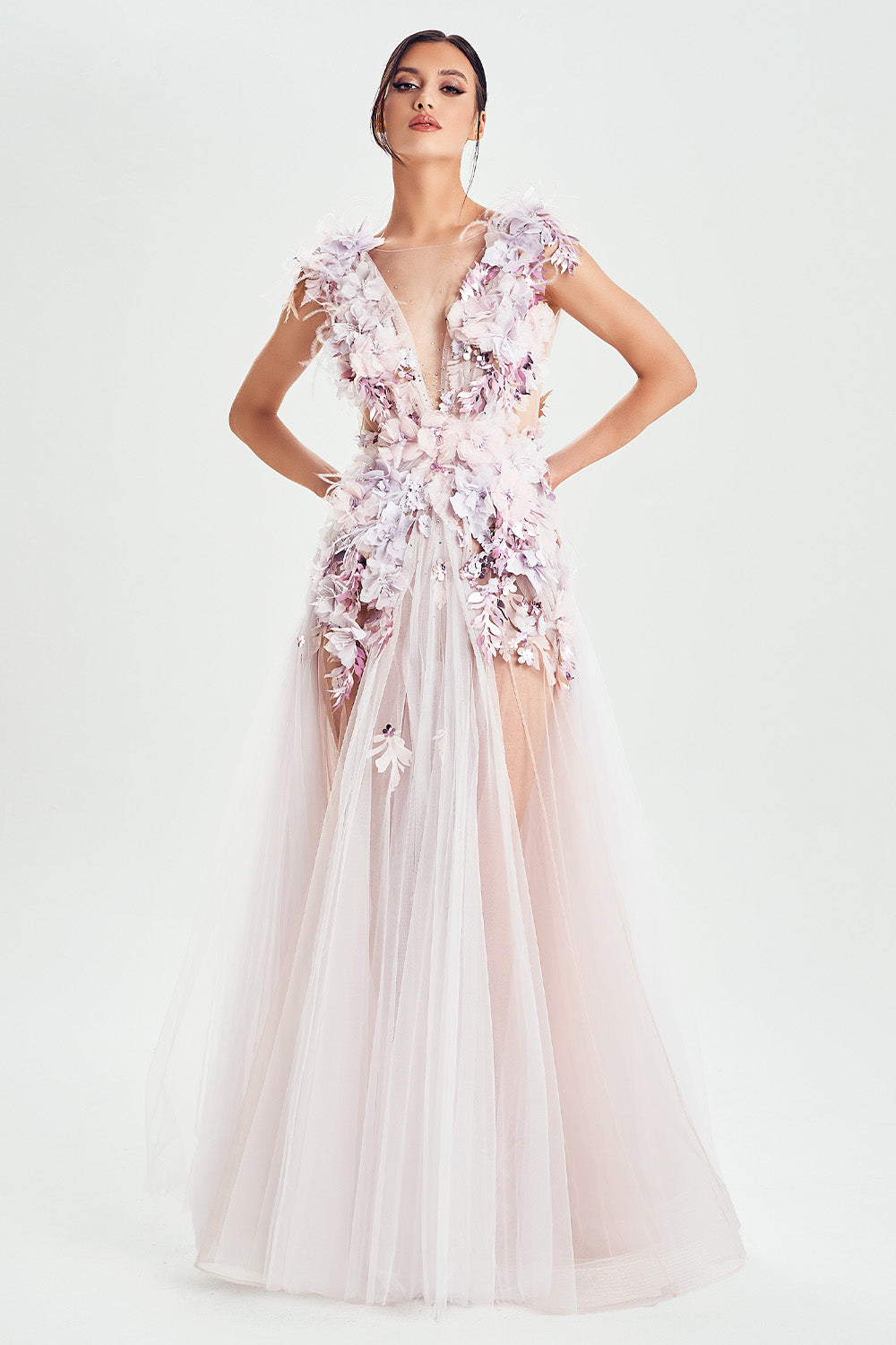 Delikatne pastele i kwieciste aplikacje tworzą baśniowy nastrój, a zwiewne tkaniny subtelnie podkreślają kobiecą finezję. Pióra dodają kompozycji subtelnego romantyzmu, miękko przełamując ciepłe faktury i aksamitne wykończenia.