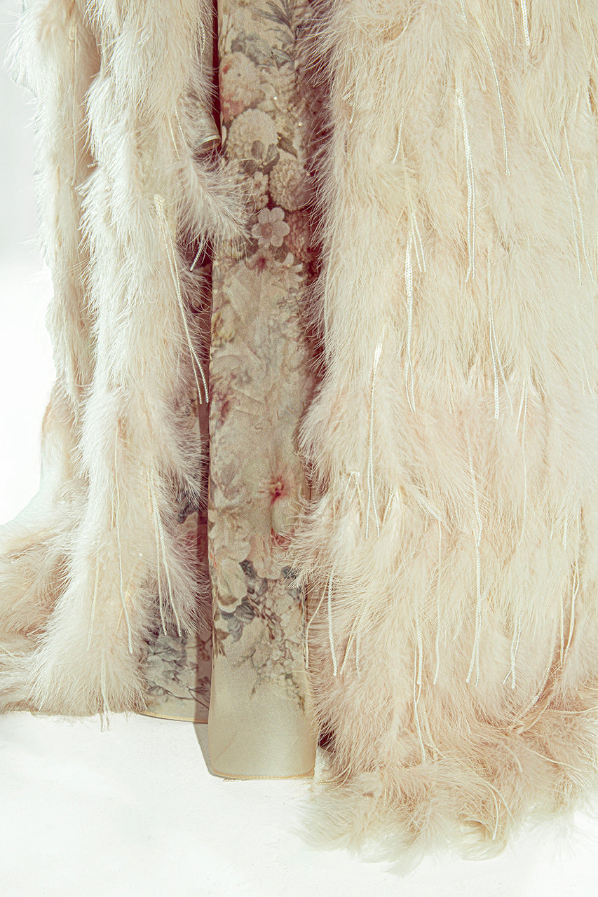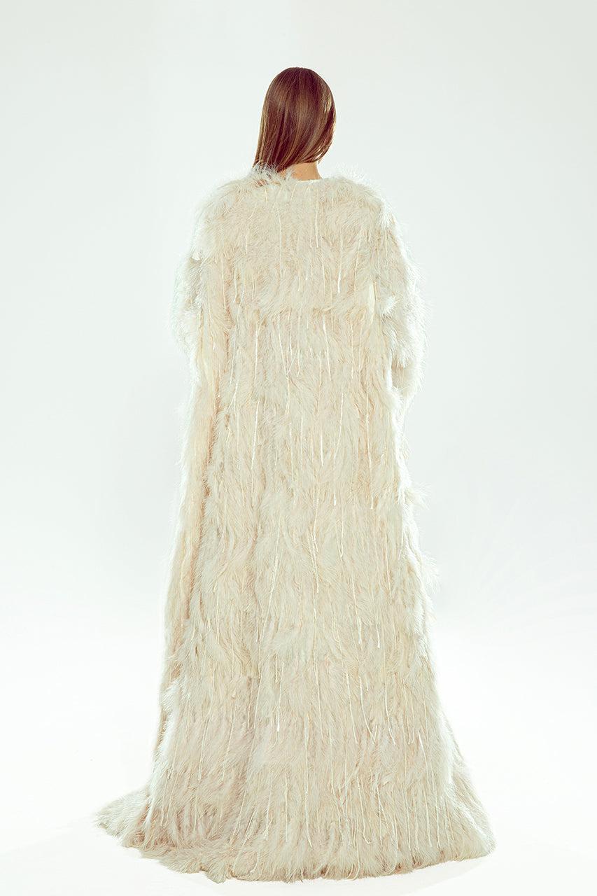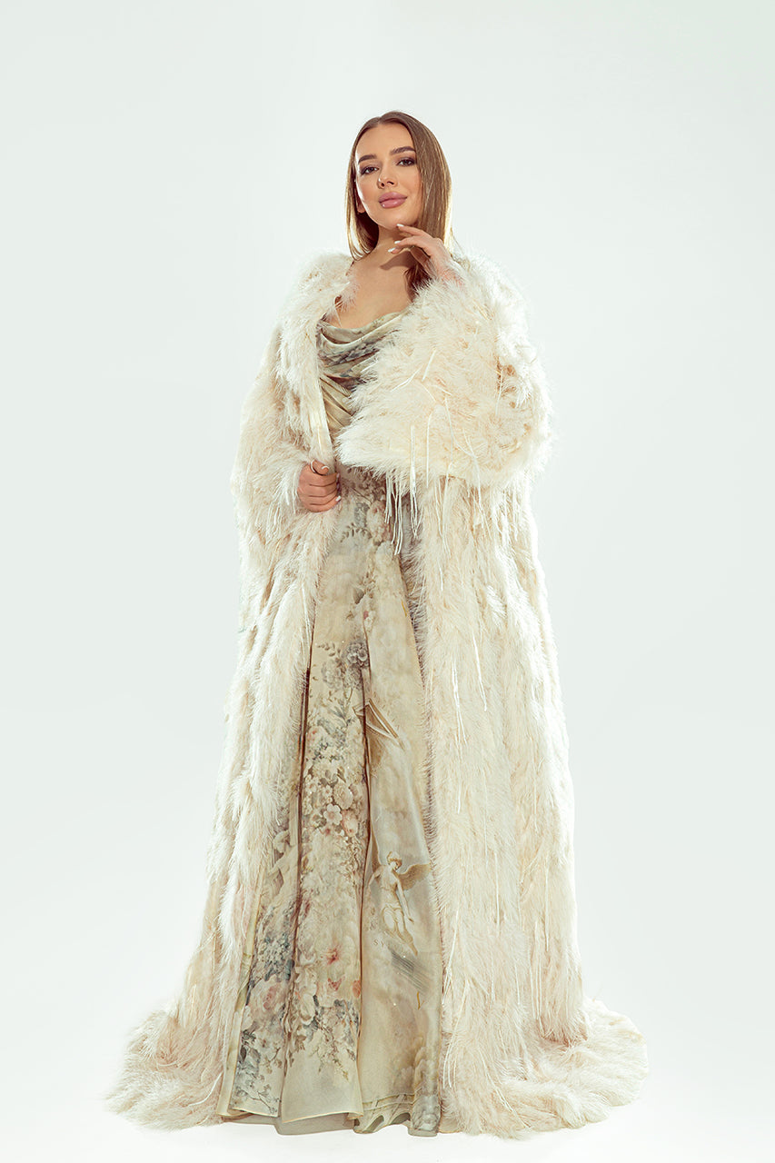 A striking piece adorned with delicate feathers and shimmering sequins. Elegant yet versatile it elevates both casual and special occasions with a touch of modern luxury