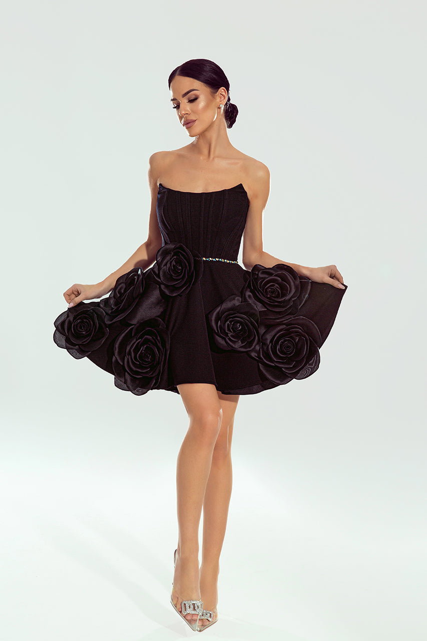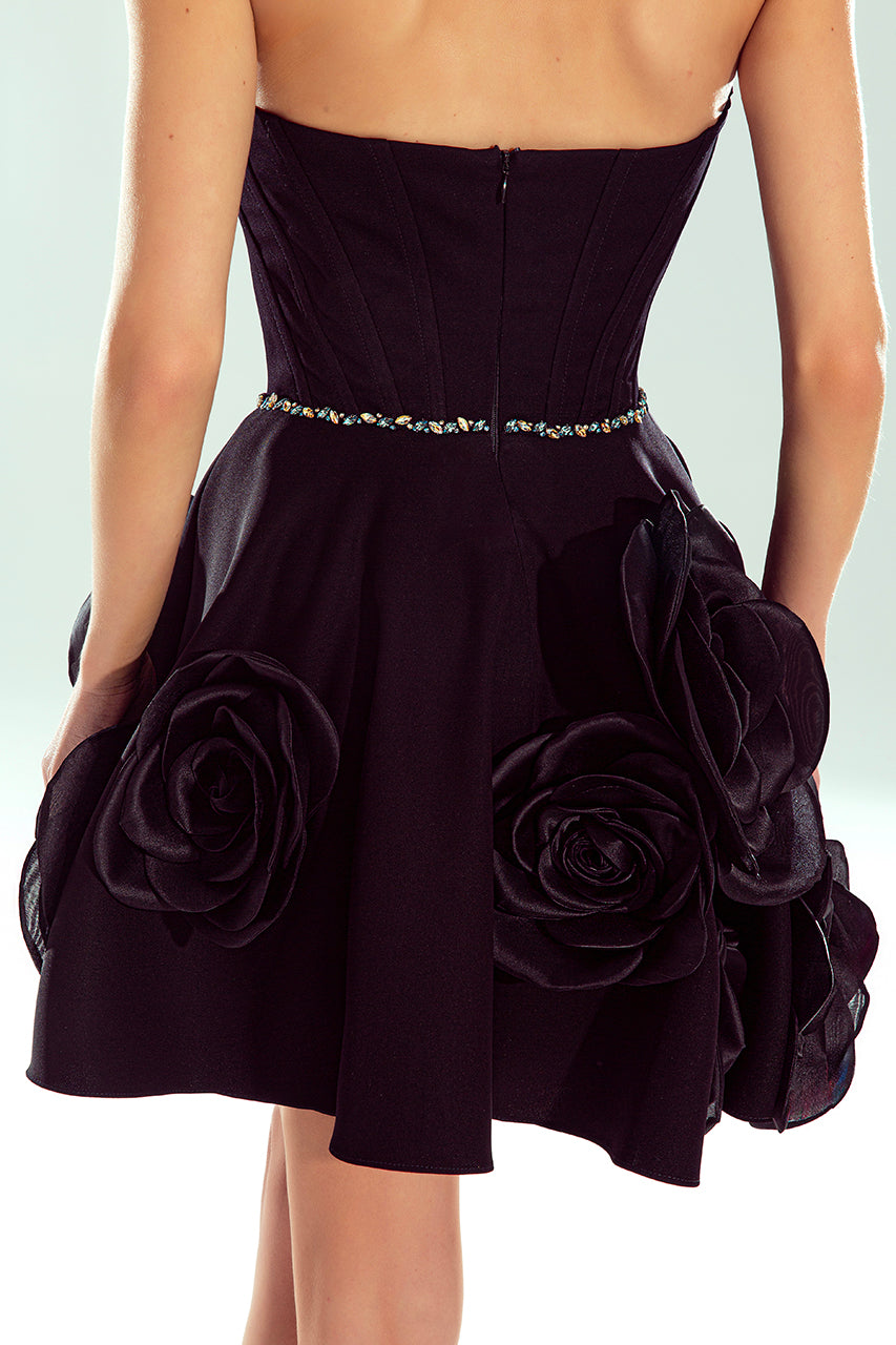 A strapless couture dress crafted in deep black, defined by sculpted corset bodice and a voluminous skirt adorned with handcrafted rose appliqués. A statement of timeless elegance, femine strength and refined luxury.