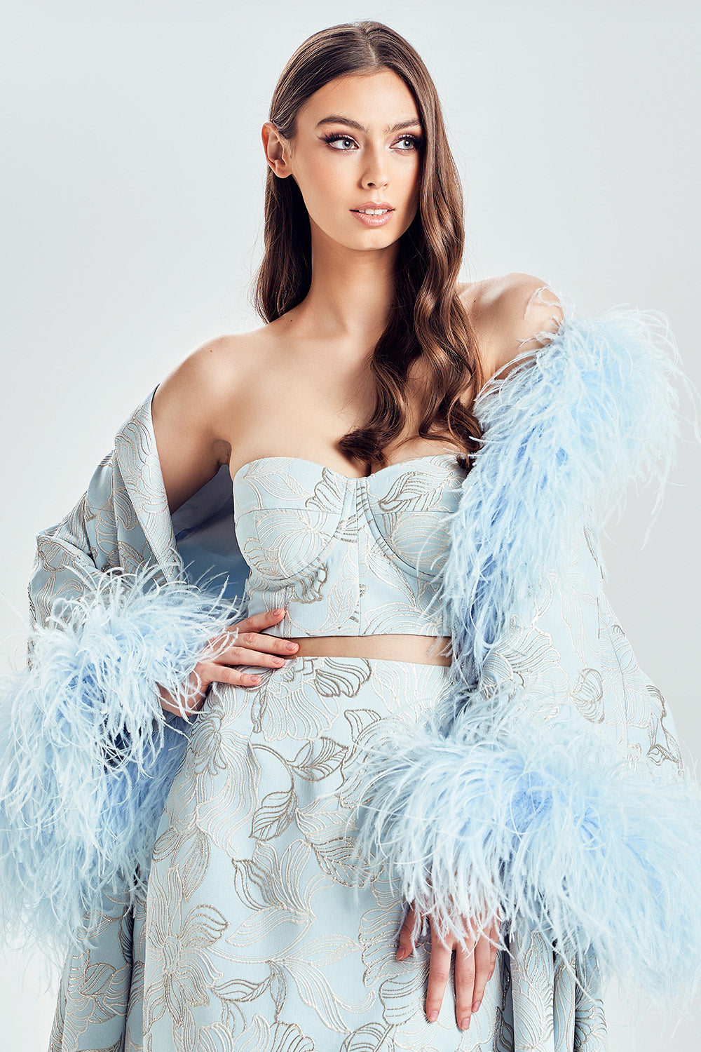 Wyrafinowany krój łączy się z subtelnym blaskiem tkaniny w tej eleganckiej kreacji, ozdobionej miękkimi, naturalnymi piórami. Delikatna podszewka i perfekcyjne wykończenie zapewniają wyjątkowy komfort, eksponując najwyższej klasy kunszt.