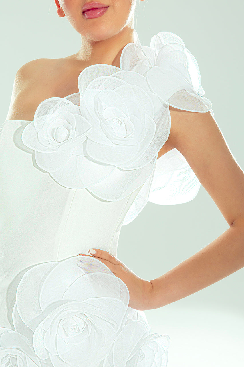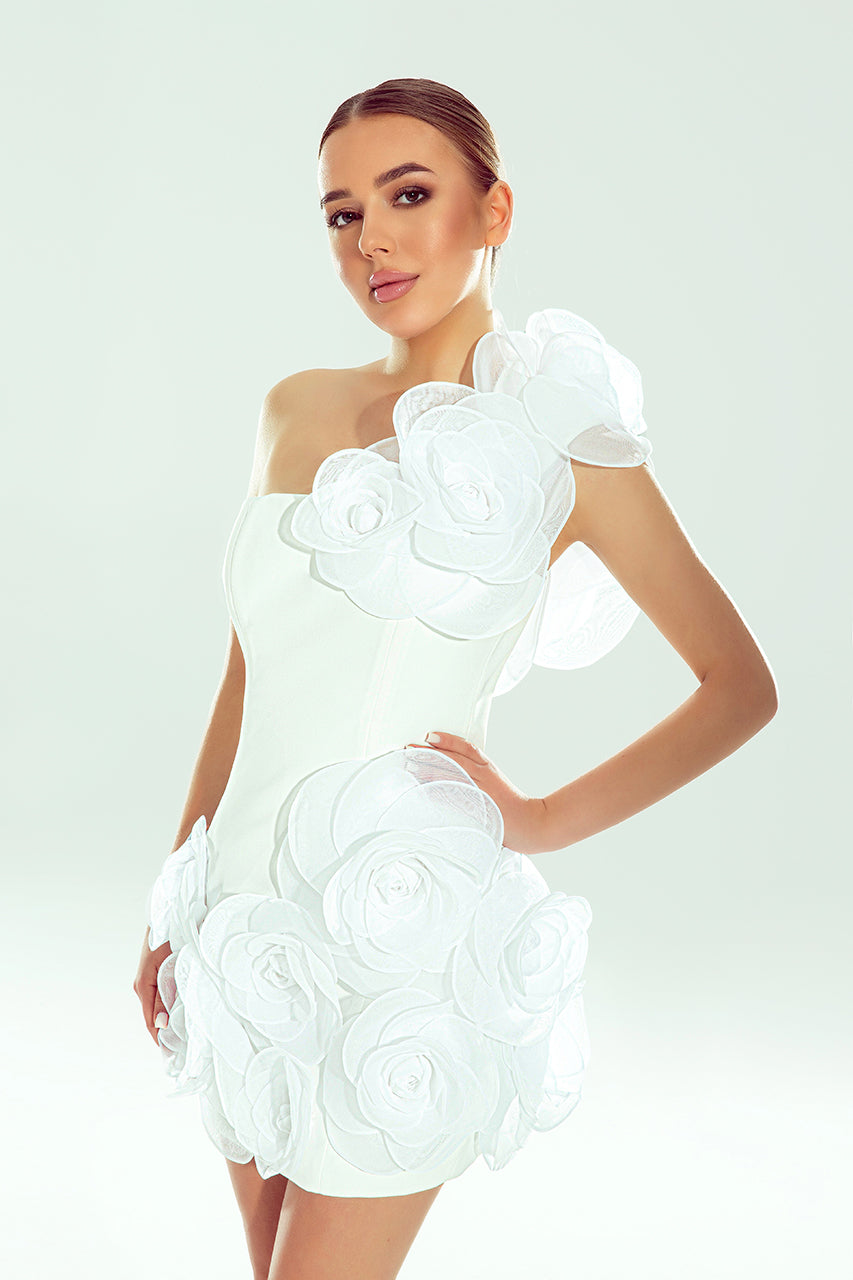A statement of modern couture elegance. This sculpted white mini dress features exquisite 3D floral appliques and an asymmerical one-shoulder design, creating a striking yet feminine silhouette.