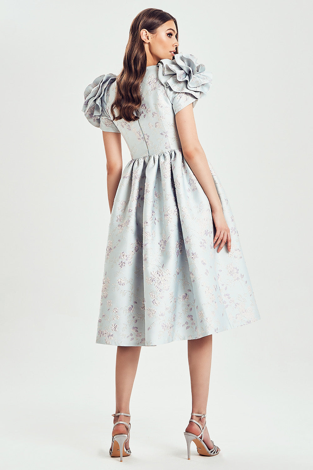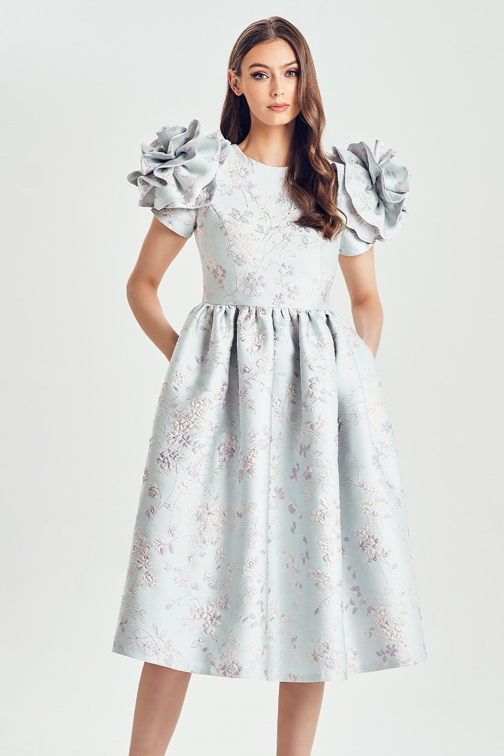 Lush floral shoulder ruffles and an embossed pattern define this striking design. A structured yet comfortable fabric shapes the figure, while the lining adds lightness and ease of movement.